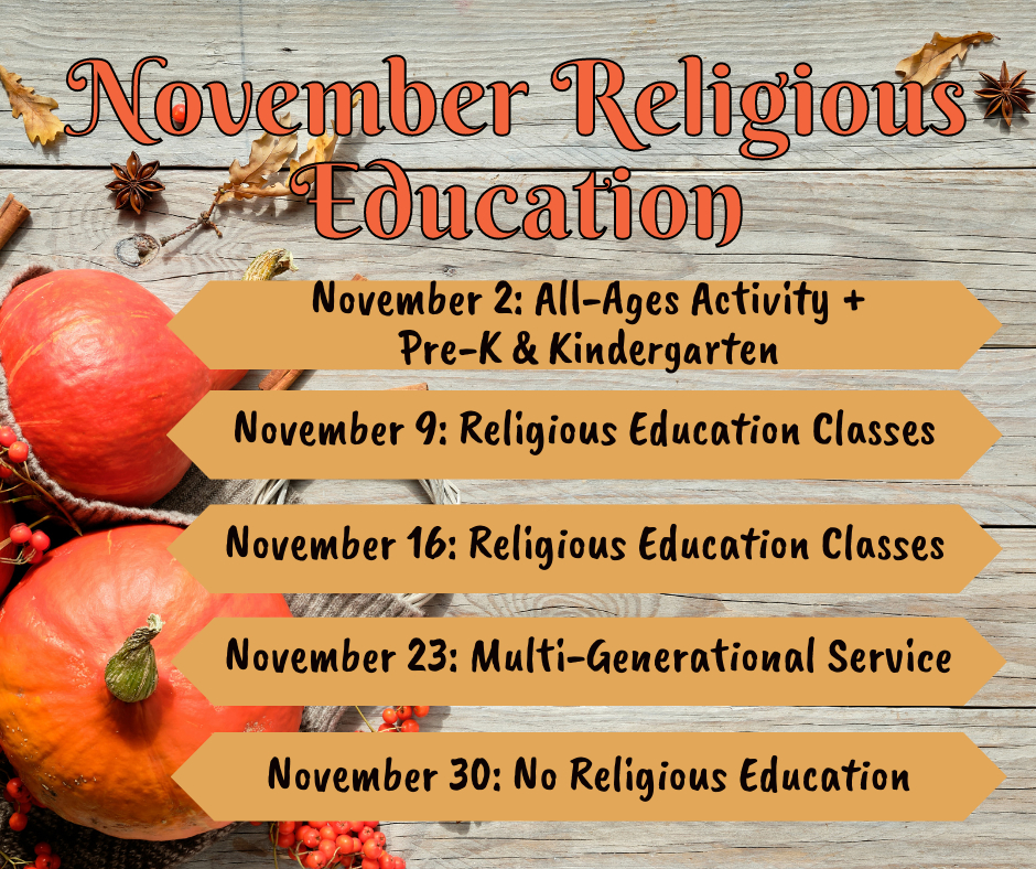 There will be no Religious Education programming on November 30. Happy Thanksgiving!